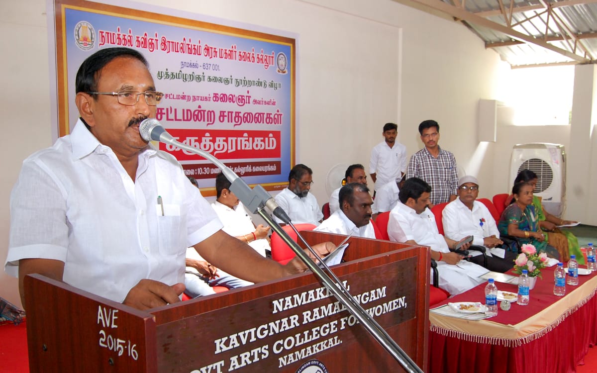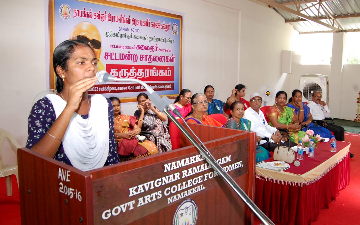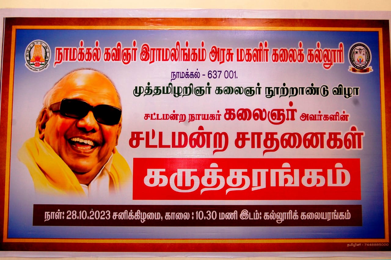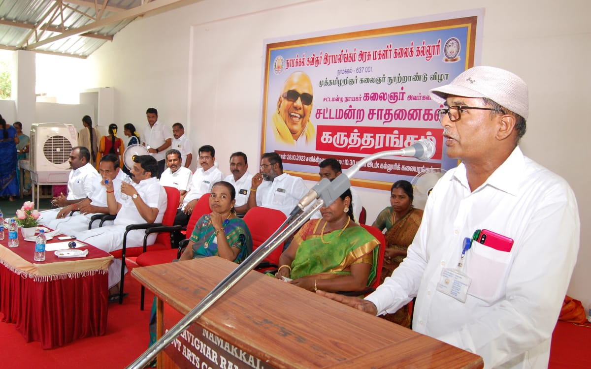 Namakkal Kavignar Ramalingam Government Arts College for Women celebrated the centenary of Muthamilarignar Kalaignar with great reverence and enthusiasm. The event was graced by Honourable Guests: Thiru. K.R.N. Rajeshkumar, Member of Parliament, and Thiru P. Ramalingam, Member of the Legislative Assembly. The principal, along with all Heads of Departments, faculty members, and coordinators, joined the celebration, making it a momentous occasion.